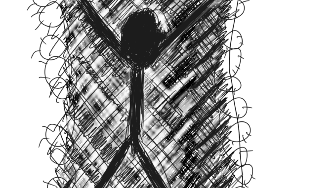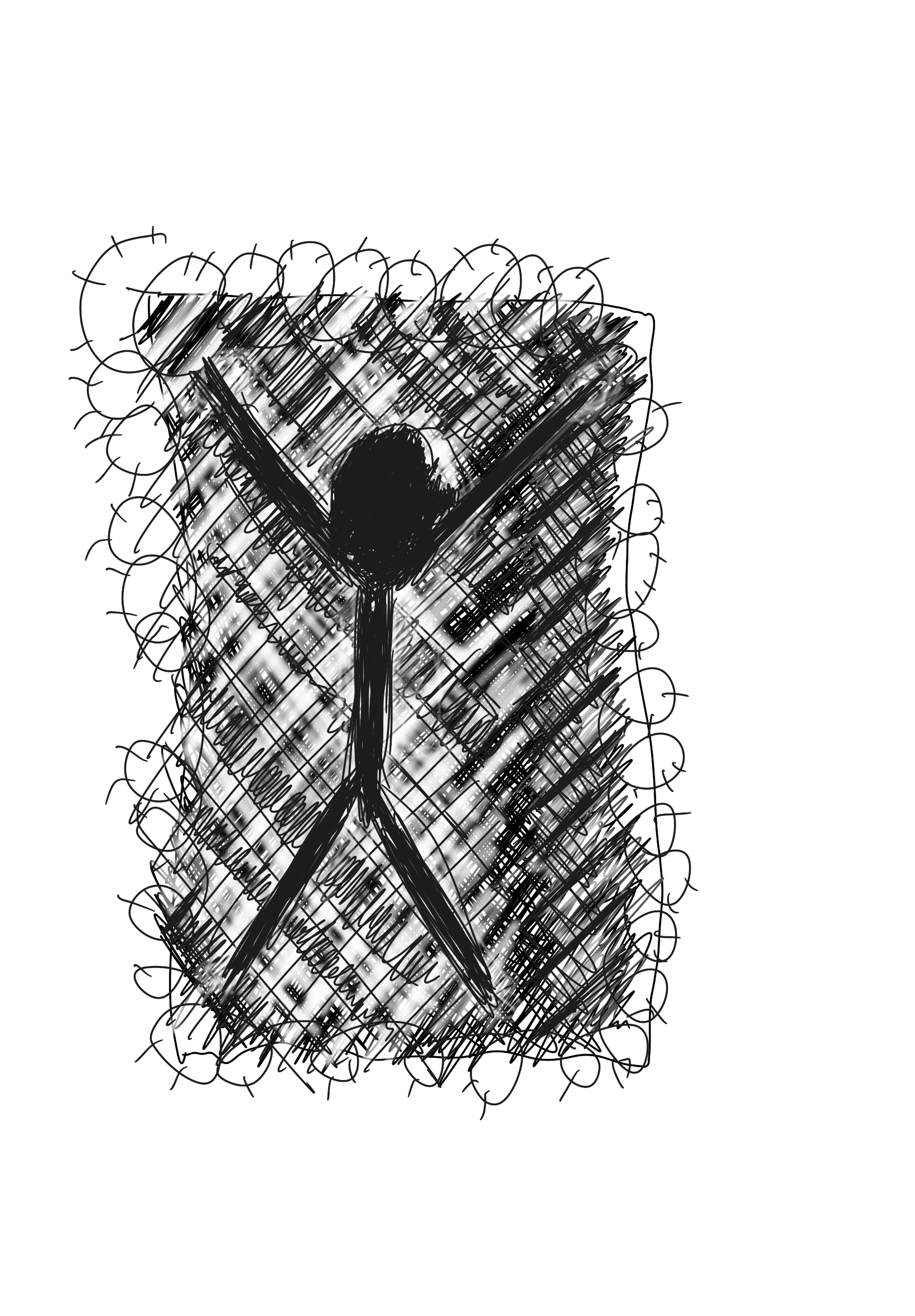 He stood. Arms ascended, back arched. In scribbles the glitch shadows in. Below him, the sacred figure data, eternally enclosed by the barbed wire. He’s a dark data print, testified for artistic posterity.